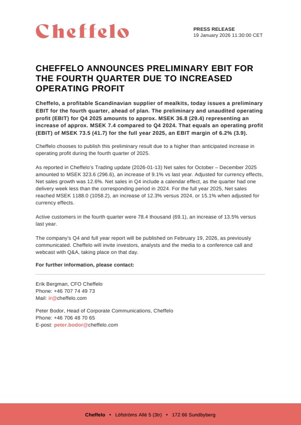Cheffelo chooses to publish this preliminary result due to a higher than anticipated increase in operating profit during the fourth quarter of 2025.