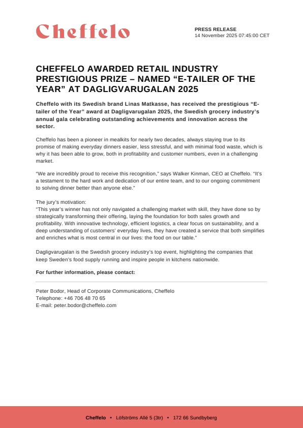 Cheffelo with its Swedish brand Linas Matkasse, has received the prestigious “E-tailer of the Year” award at Dagligvarugalan 2025, the Swedish grocery industry’s annual gala celebrating outstanding achievements and innovation across the sector.