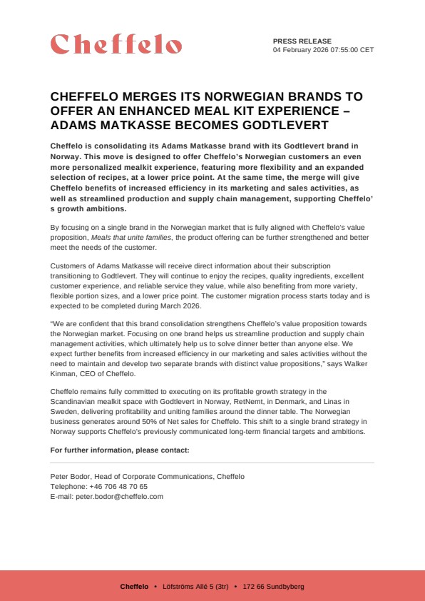 Cheffelo is consolidating its Adams Matkasse brand with its Godtlevert brand in Norway. This move is designed to offer Cheffelo’s Norwegian customers an even more personalized mealkit experience, featuring more flexibility and an expanded selection of recipes, at a lower price point. At the same time, the merge will give Cheffelo benefits of increased efficiency in its marketing and sales activities, as well as streamlined production and supply chain management, supporting Cheffelo’s growth ambitions.