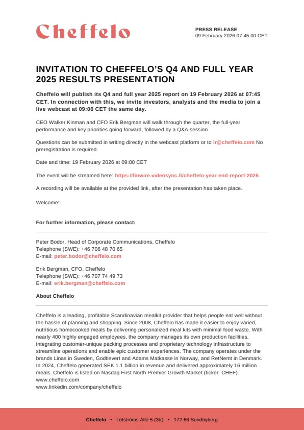 Cheffelo will publish its Q4 and full year 2025 report on 19 February 2026 at 07:45 CET. In connection with this, we invite investors, analysts and the media to join a live webcast at 09:00 CET the same day.