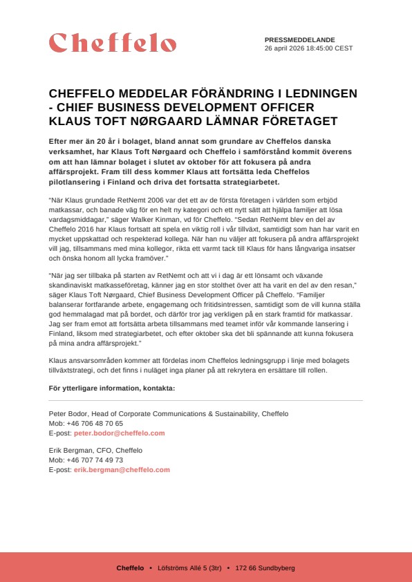 Efter mer än 20 år i bolaget, bland annat som grundare av Cheffelos danska verksamhet, har Klaus Toft Nørgaard och Cheffelo i samförstånd kommit överens om att han lämnar bolaget i slutet av oktober för att fokusera på andra affärsprojekt. Fram till dess kommer Klaus att fortsätta leda Cheffelos pilotlansering i Finland och driva det fortsatta strategiarbetet.