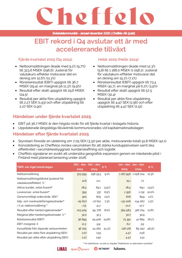 Cheffelo, en ledande leverantör av matkassar i Norden, offentliggjorde i dag sina finansiella resultat för fjärde kvartalet och helåret 2025. Bolaget meddelade samtidigt planer på att genomföra ett pilotprojekt avseende geografisk expansion till Finland.