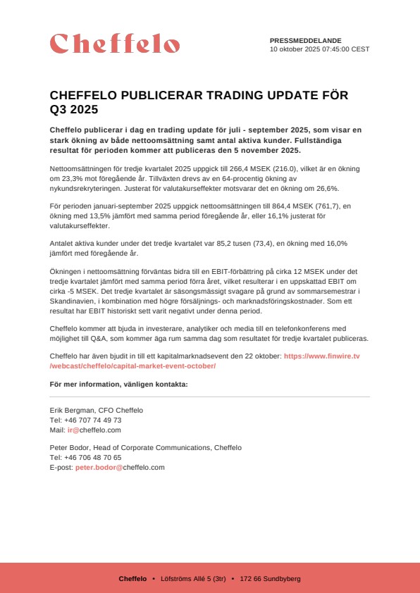 Cheffelo kommer att bjuda in investerare, analytiker och media till en telefonkonferens med möjlighet till Q&A, som kommer äga rum samma dag som resultatet för tredje kvartalet publiceras.